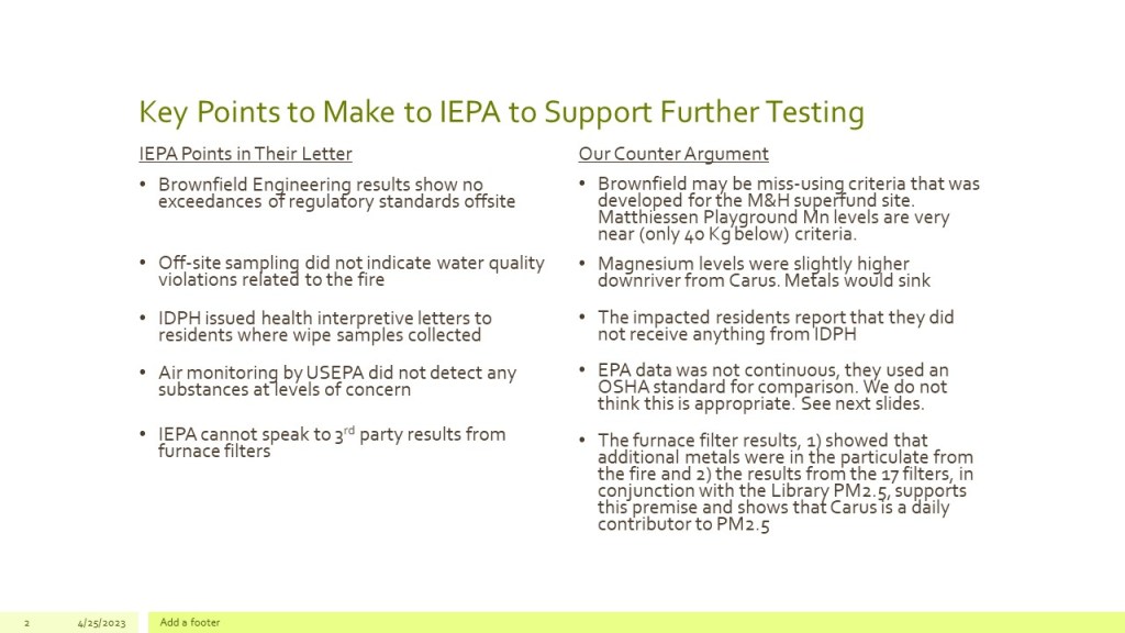 “The library data shows there isn’t any difference in the pre-fire or post-fire and plant restart in the air quality,” said Landtiser. Residents pointed out that Carus’ analysis conflicts with the Sierra Club’s analysis of the library air monitor data. Carus did not give details about how they made the analysis and announced they purchased an air monitor for the city of LaSalle to track data.