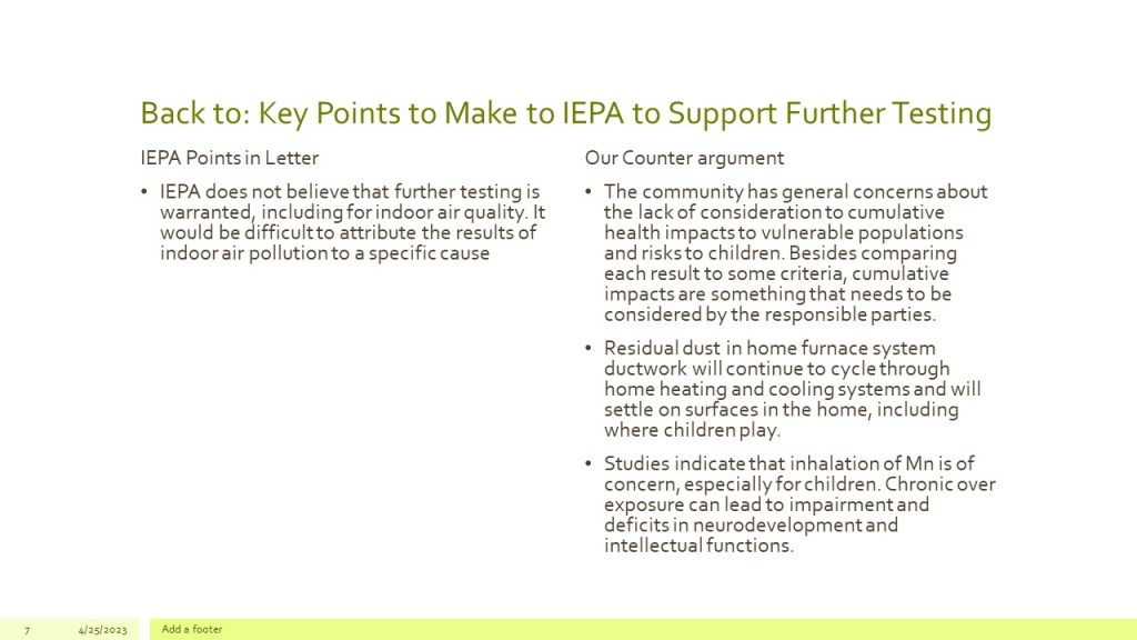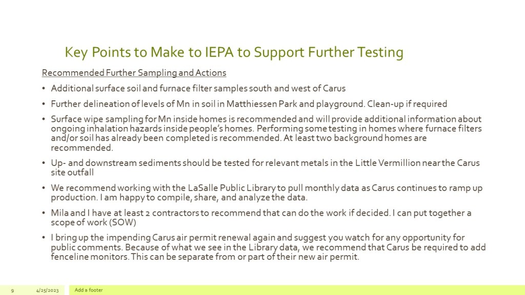 Denise sent the below letter outlining her concerns and recommendations to the EPA and LaSalle City Council about Carus Chemicals’ manufacturing plant, Ottawa storage building and toxic waste landfill.