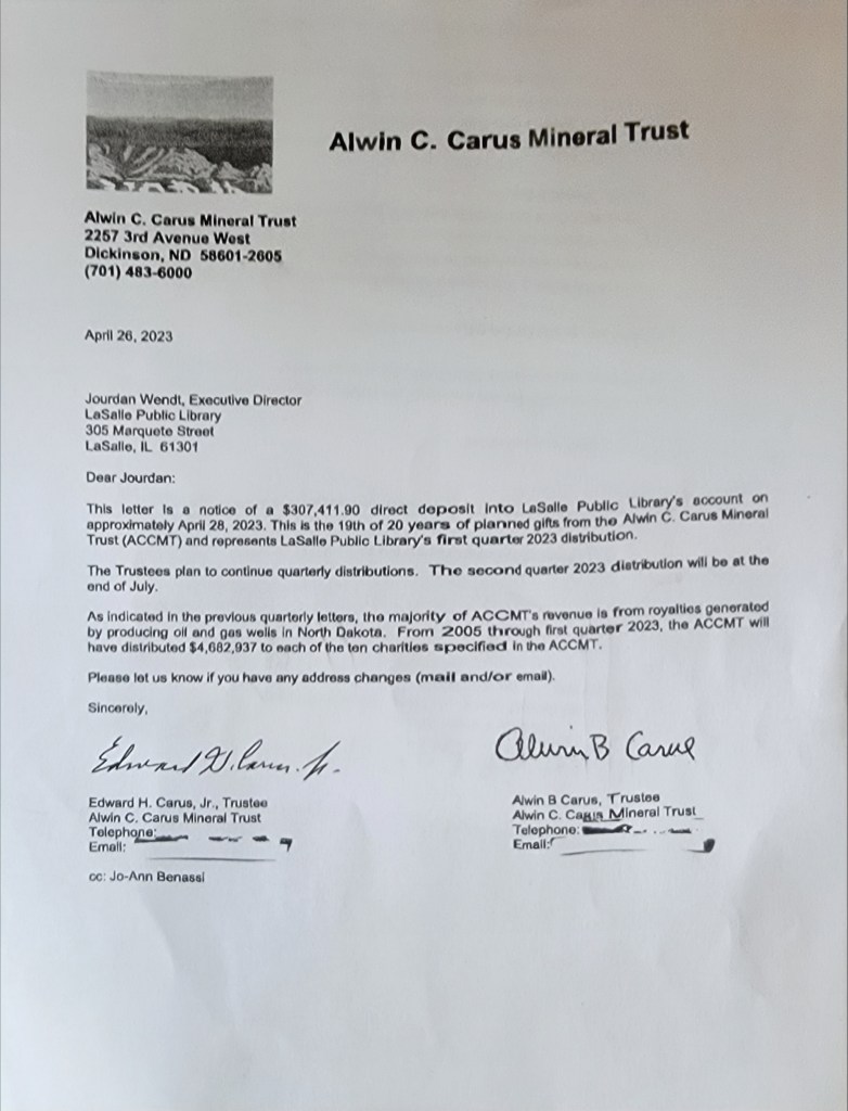 June 11, 2023, LA SALLE, IL – Carus donated over $300,000 to LaSalle Public Library shortly after the Sierra Club testified at the city council meeting about heavy metals and air pollution being emitted from Carus Chemicals.