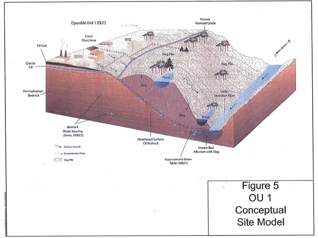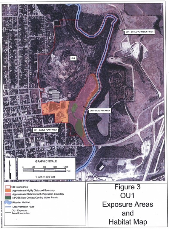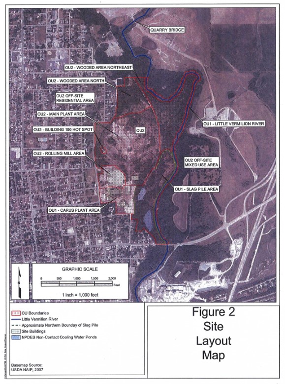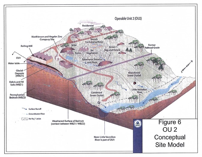 LA SALLE, IL – The U.S. Environmental Protection Agency is proposing changes to the groundwater contamination status and monitoring at the Matthiessen and Hegeler Zinc (M & H) Superfund site in La Salle, Illinois. The contaminated site includes nearly 5,000 homes, covers most of the city of La Salle and incorporates an 80-foot-tall slag pile owned by Carus Chemicals. The 17-acre pile of slag and sinter borders the Little Vermillion River, which empties into Illinois River. From there, it empties into the Mississippi River and the Gulf of Mexico.